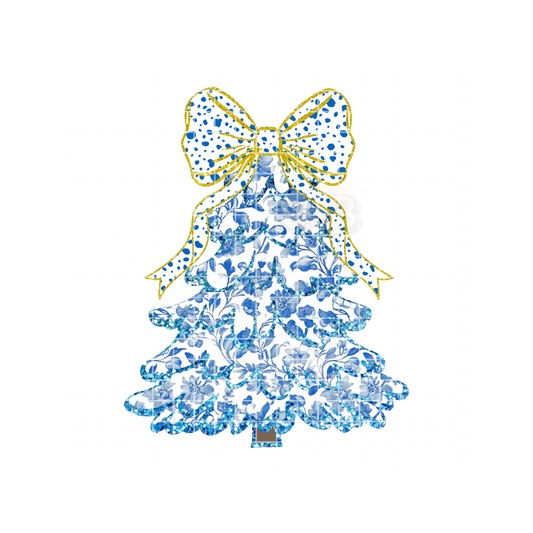 Christmas Tree Bow Blue Flowers DTF Transfer