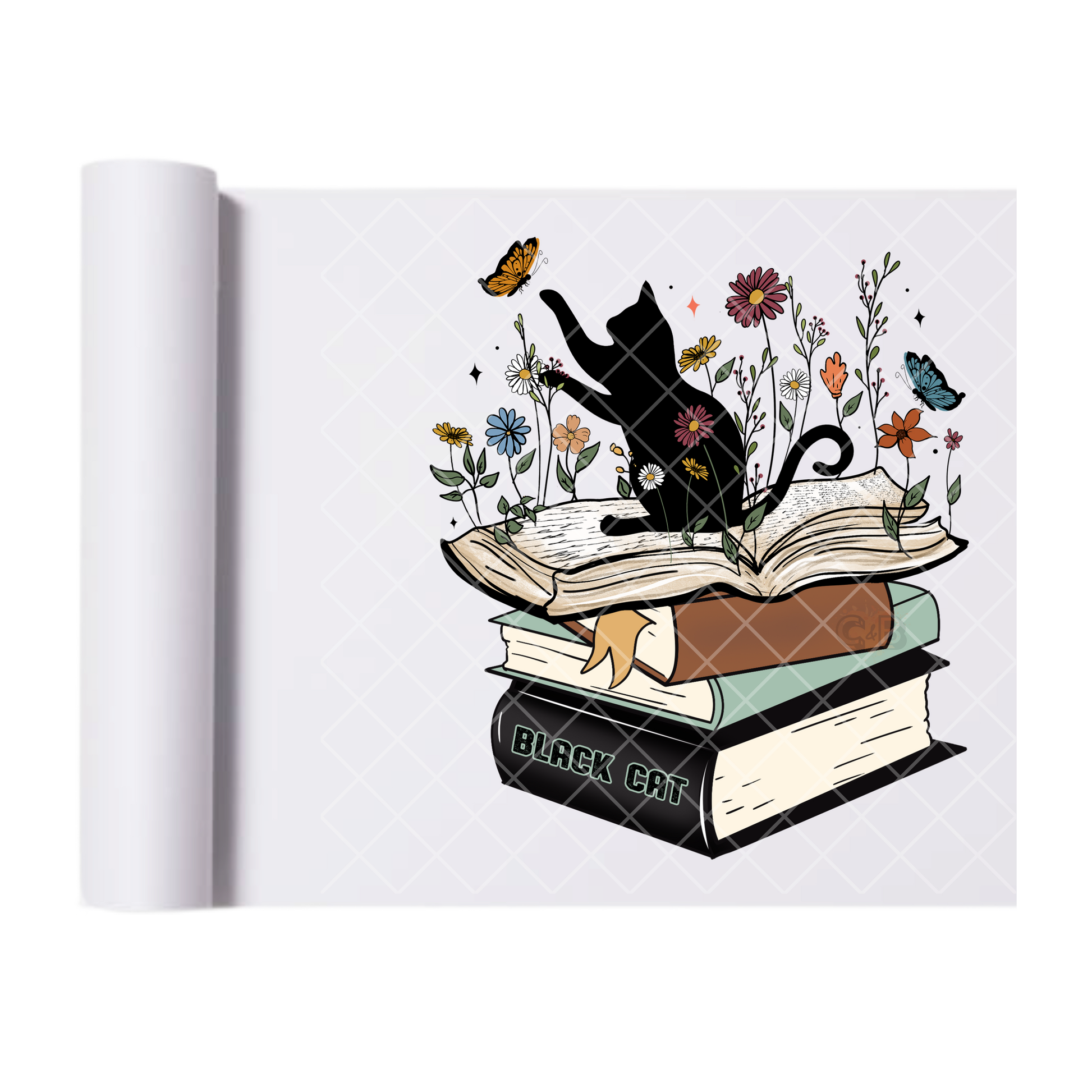 Black Cat Stack Of Books - Direct Print Film Transfer for T-Shirts, Cotton, Polyester & Blends - High-Quality Print